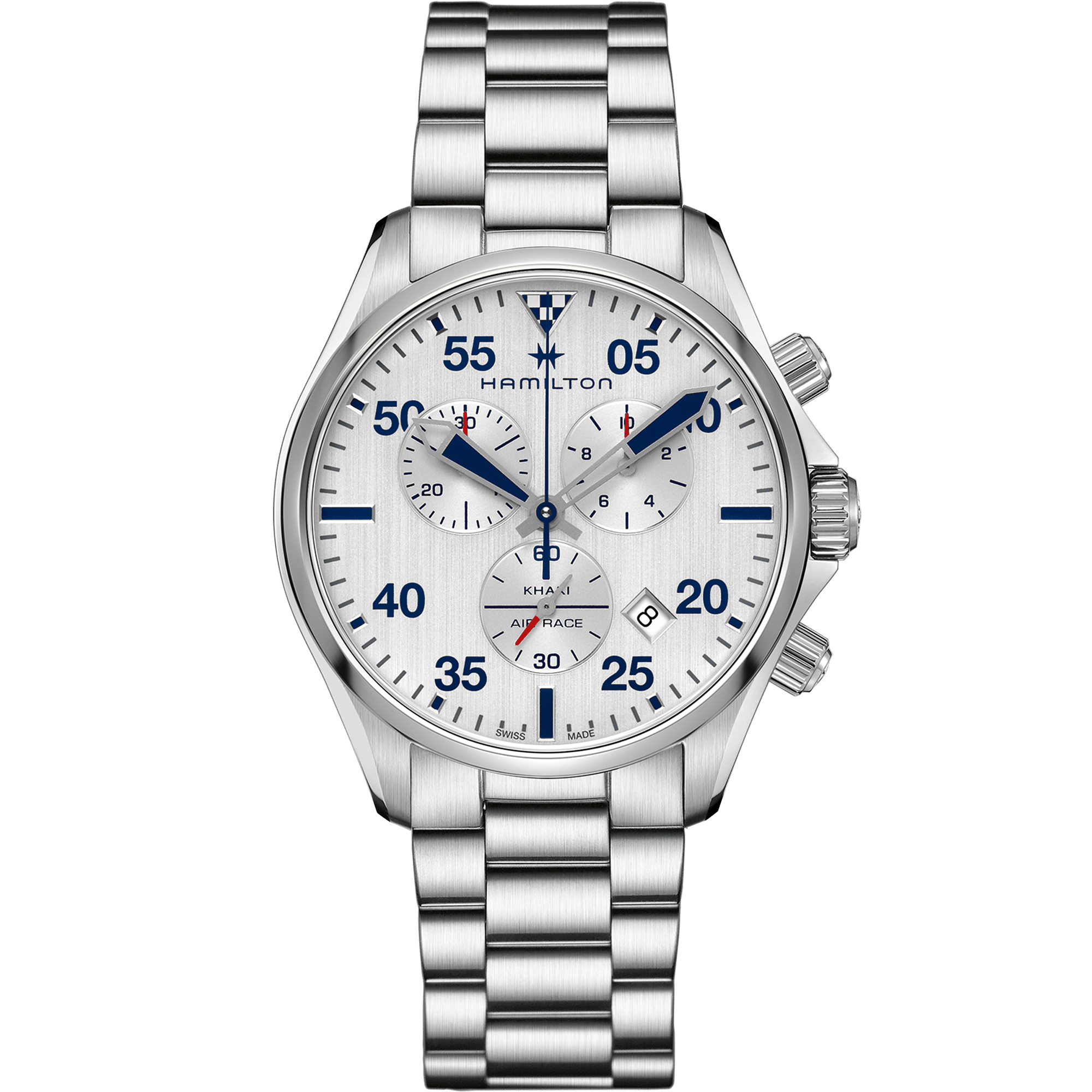 Questo cronografo sportivo al quarzo con cassa in acciaio da 44 mm rende omaggio a Hamilton come cronometrista ufficiale della Red Bull Air Race 2018. Un connubio perfetto tra stile da aviatore e precisione svizzera.
