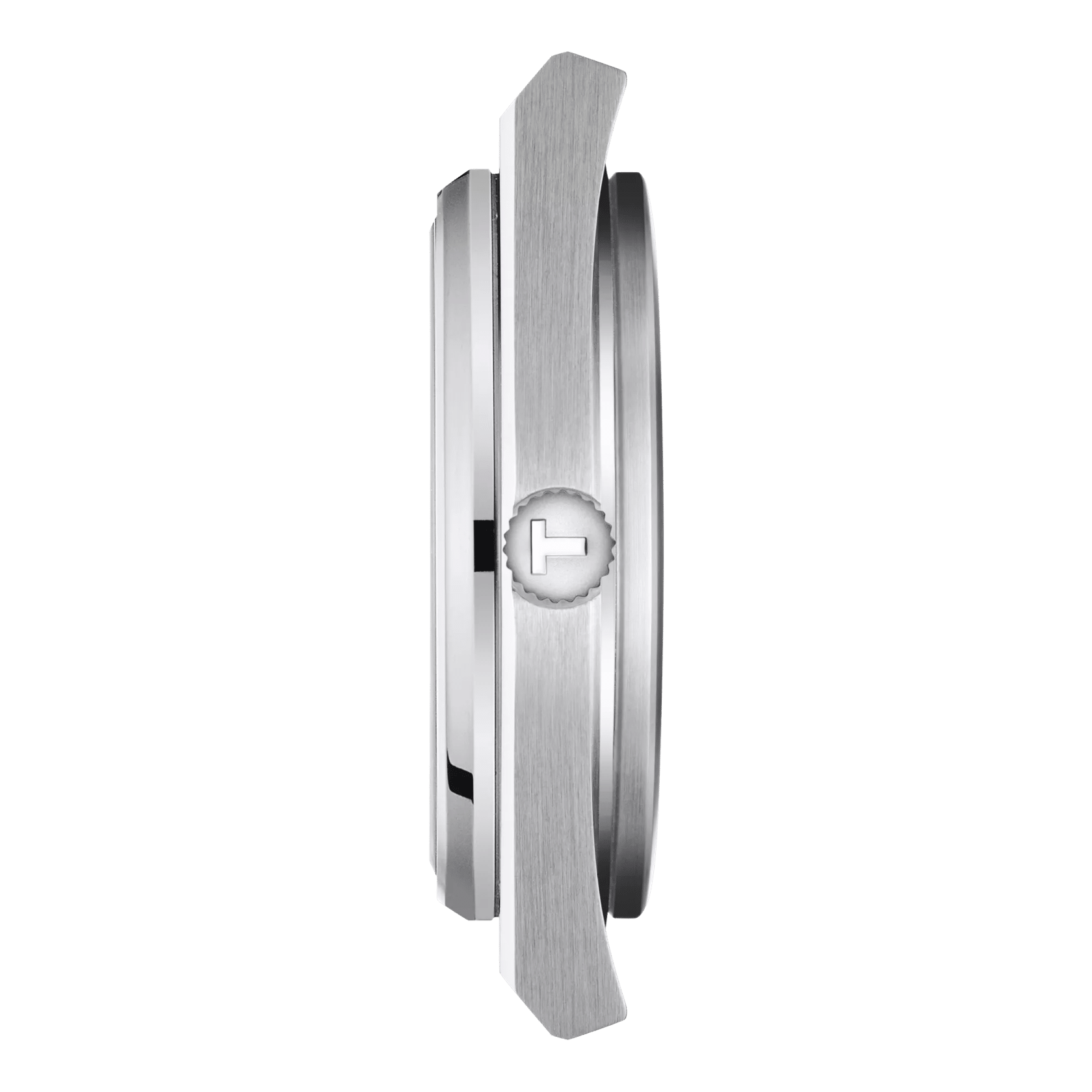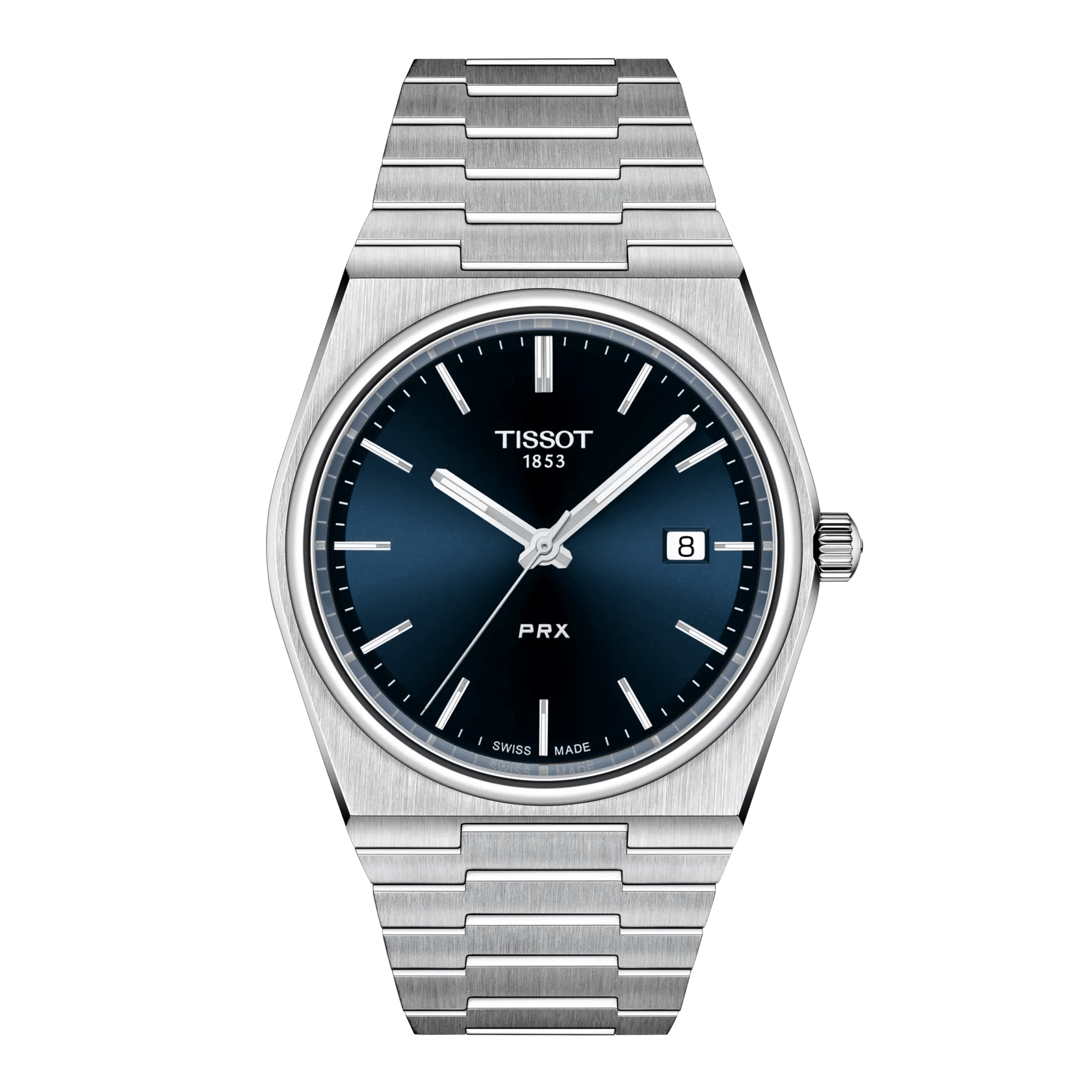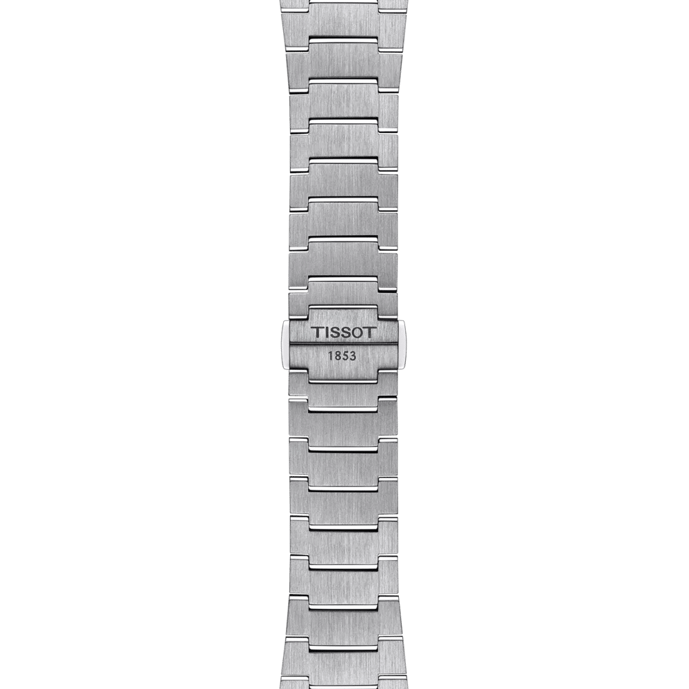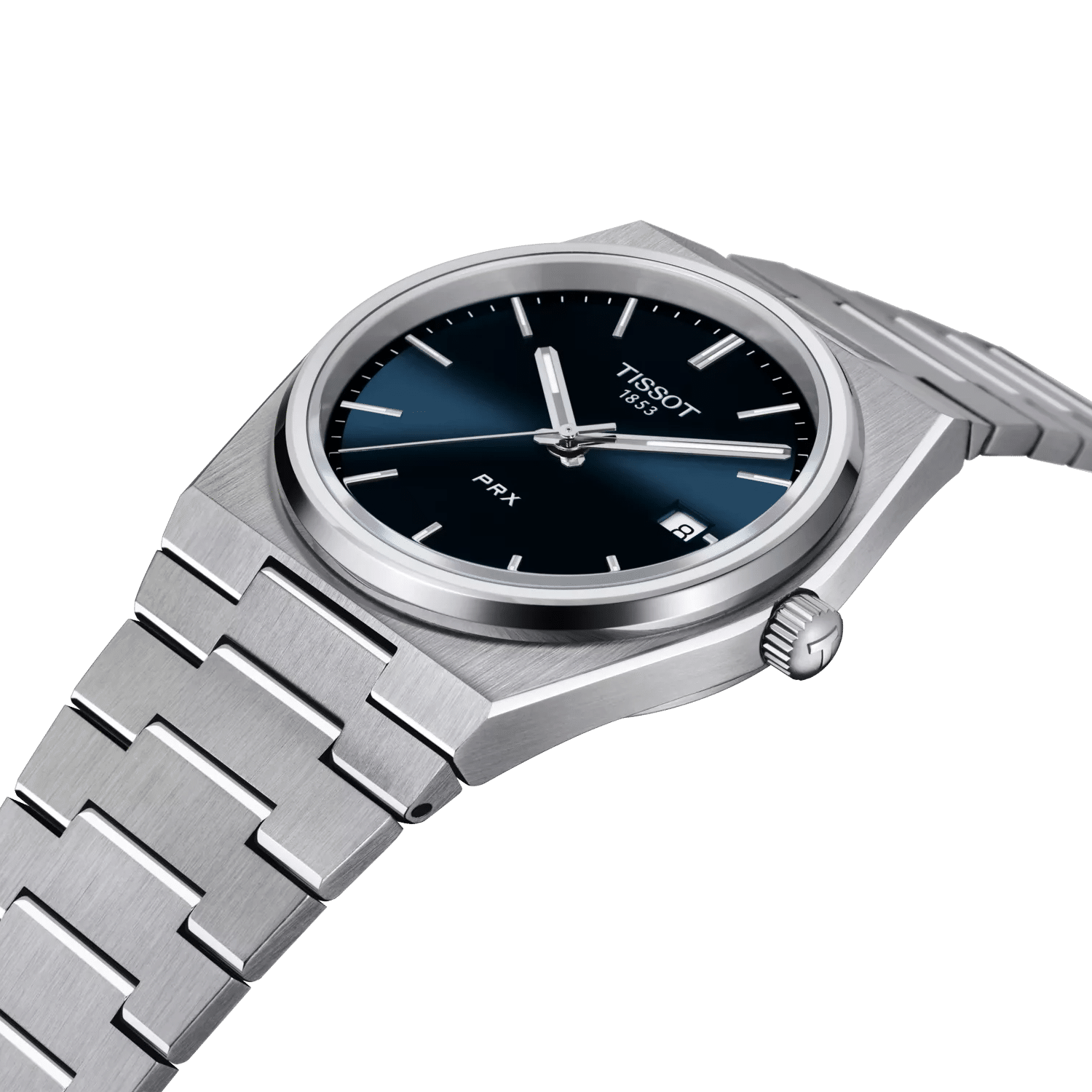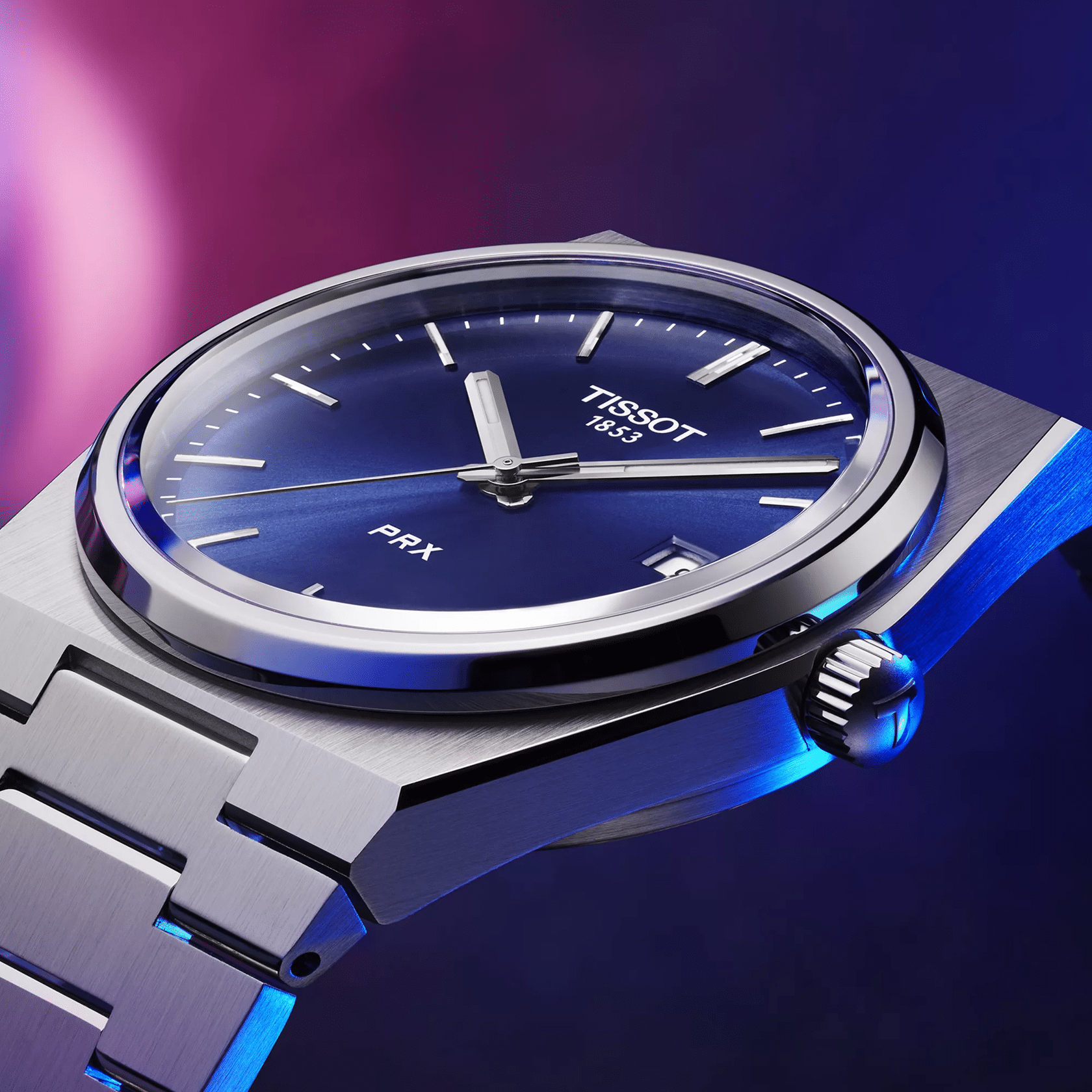 Nel 1978 Tissot creò un modello al quarzo, caratterizzato da una cassa sottile, indici stretti e un bracciale in acciaio. La sua ampia ansa orizzontale, tipica dell’epoca, era perfettamente integrata nella cassa piatta a forma di tonneau. Pochi anni dopo, Tissot ha registrato il nome PRX. “PR” sta per “preciso” e “robusto”. La “X” sta per il numero romano dieci e per la pressione di 10 bar che l’orologio è in grado di sopportare. Nel 2021 Tissot ha presentato il PRX 40205, È una versione moderna del modello precedente. La cassa in acciaio inossidabile 316L del Tissot PRX 40205 ha un diametro di 40 mm. Ha una forma leggermente tonneau ed è ornato da una lunetta stretta e rotonda. Ai lati, spazzolate verticalmente, finiture arrotondate si alternano a sfaccettature lucide. Il Tissot PRX 40205 Quartz è dotato di un quadrante con un motivo a raggiera nero o blu in combinazione con indici e lancette nichelati. Esiste anche una variante con quadrante grigio argento satinato con indici e lancette color oro rosa, una combinazione di colori che ricorda la fine degli anni ’70. La flessibilità e morbidezza delle maglie ne fanno un vero successo di design ergonomico e trasmettono uno straordinario comfort. Le lancette del PRX 40 205 sono dotate di un rivestimento SuperLumiNova® e sono posizionate l’una sull’altra con uno spazio minimo. Ciò consente di avvicinare il quadrante al vetro dell’orologio. L’effetto ottico ottenuto dai designer Tissot fa sembrare la cassa dell’orologio ancora più piatta e sottile di quanto non sia in realtà.